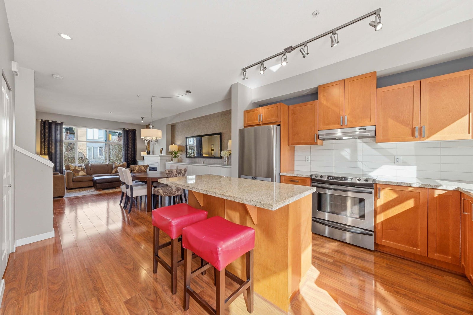Built Green" by Polygon in 2010. This luxurious 4 bed, 3.5 bath townhome is set against a backdrop of mountains & is steps away to biking & hiking trails. This unit features a contemporary interior with an open concept main floor layout, gourmet kitchen with granite countertops & S/S appliances. 9' ceilings on both levels. Indoor/outdoor entertaining with a balcony off the kitchen, gas BBQ allowed. The primary suite is perfection with double sinks, separate shower & soaker tub. 4th bedroom/office/rec room down with full bathroom. Lots of storage. Side-by-side garage! Plus 2 cars on driveway. Short walk to Lynnmour Elementary, Digger Park & Inter-River Park. Family & pet friendly, well maintained complex.