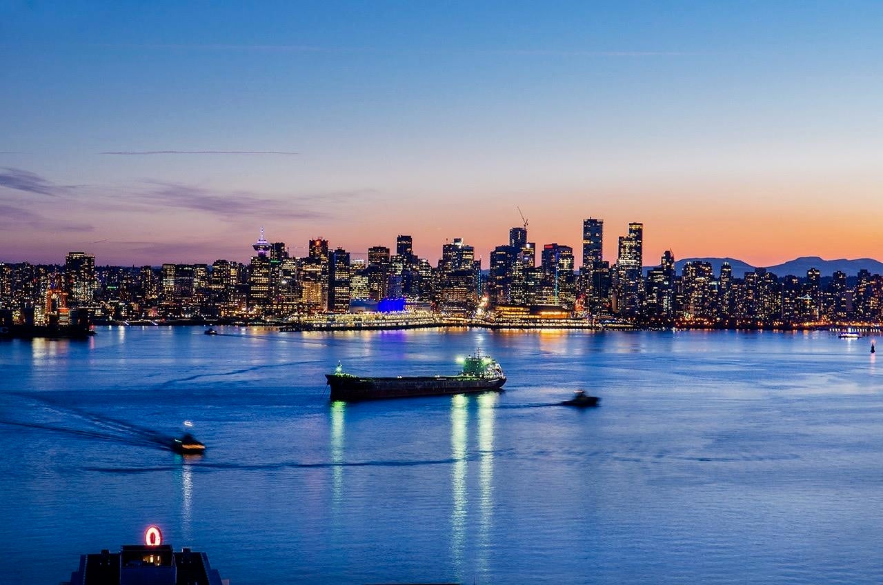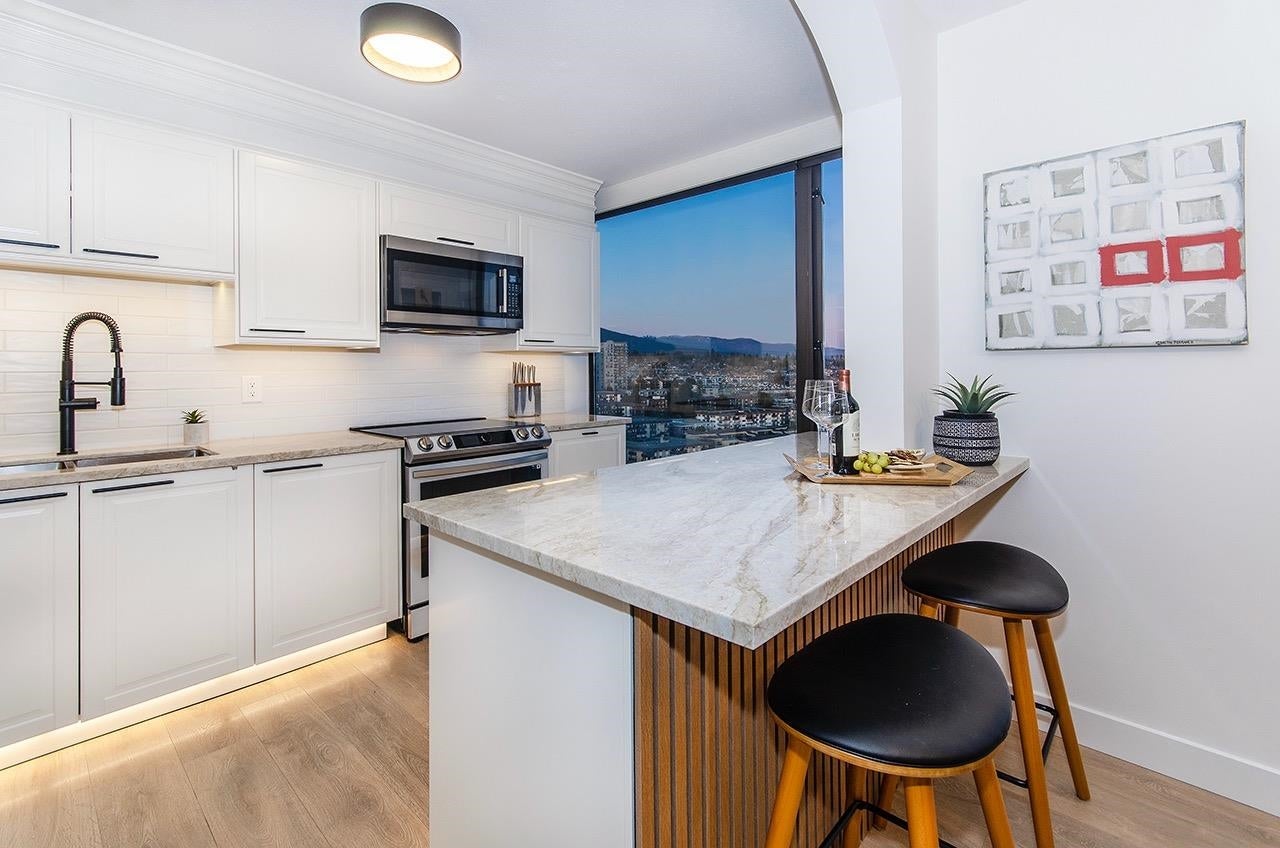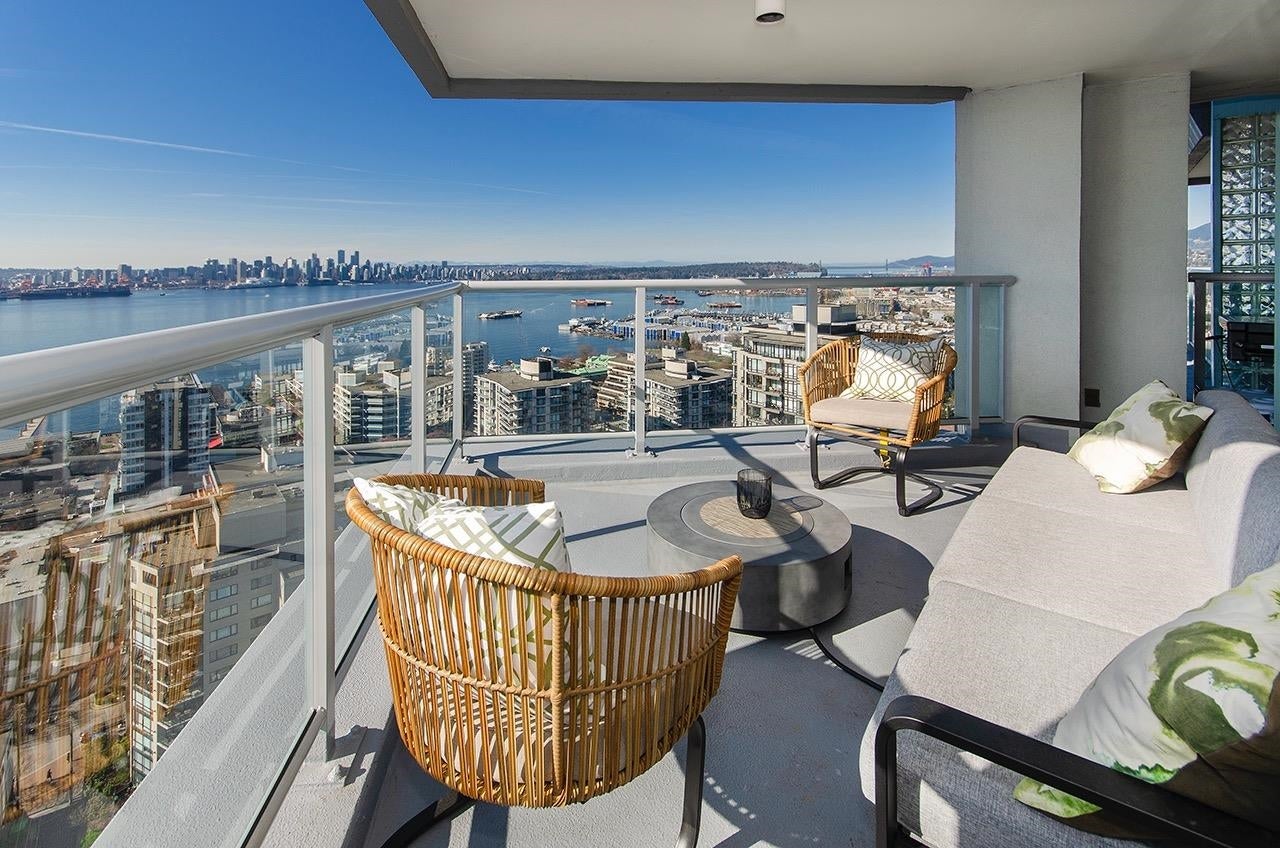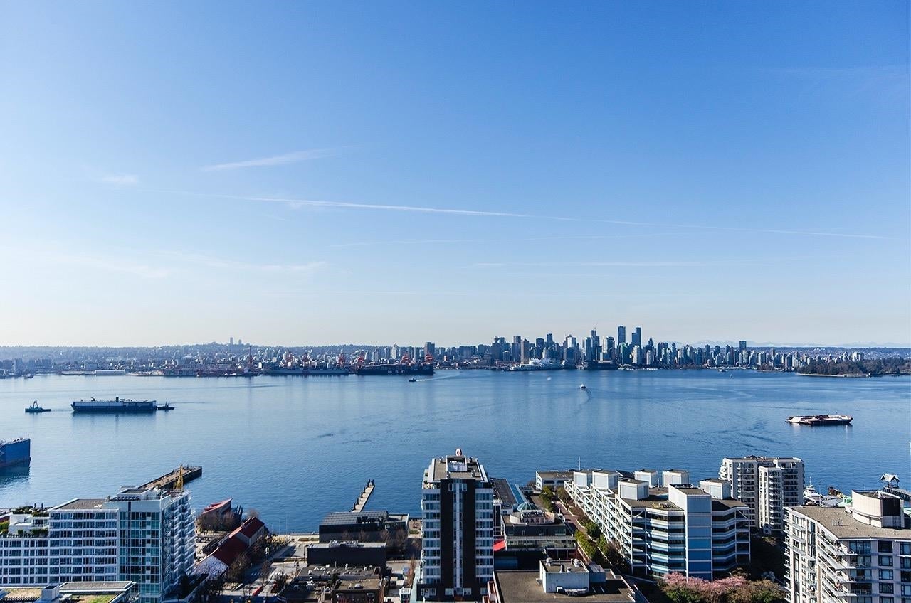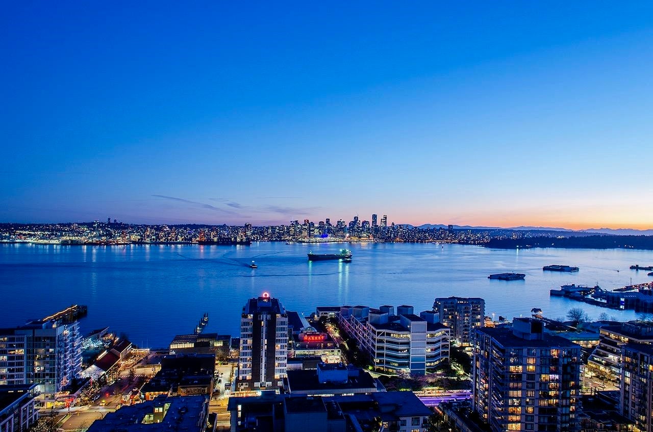SKY-HIGH LUXURY IN LOWER LONSDALE! Perched on the 26th floor of the area's tallest tower, this nearly 1,100 sq ft masterpiece offers views that simply cannot be topped. Step onto your private patio and get lost in a 270-degree panorama—from Mount Baker and the city skyline to the open waters of the Gulf Islands. This thoughtful renovation features a wide-open kitchen and living area designed specifically to pull those stunning views into every corner of the home, including the spa-like ensuite with therapeutic jetted Bath. You’ve got a proper entry foyer, an actual laundry room, and two side-by-side parking stalls (best location, beside lobby entrance). Outdoor pool, Gym and a refreshed lobby exit to the Shipyards’ best coffee and grocery. It's arguably the best seat in the city.