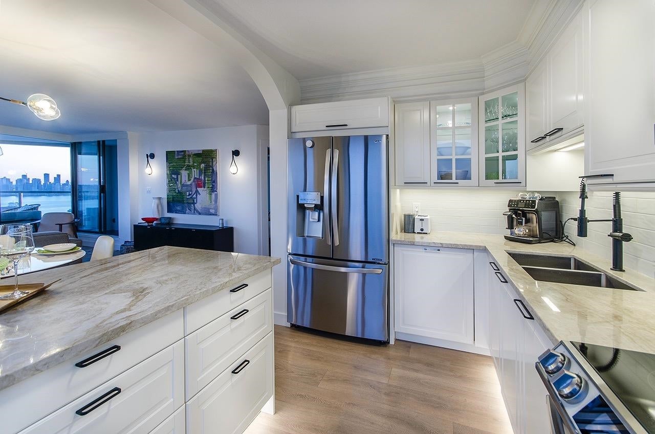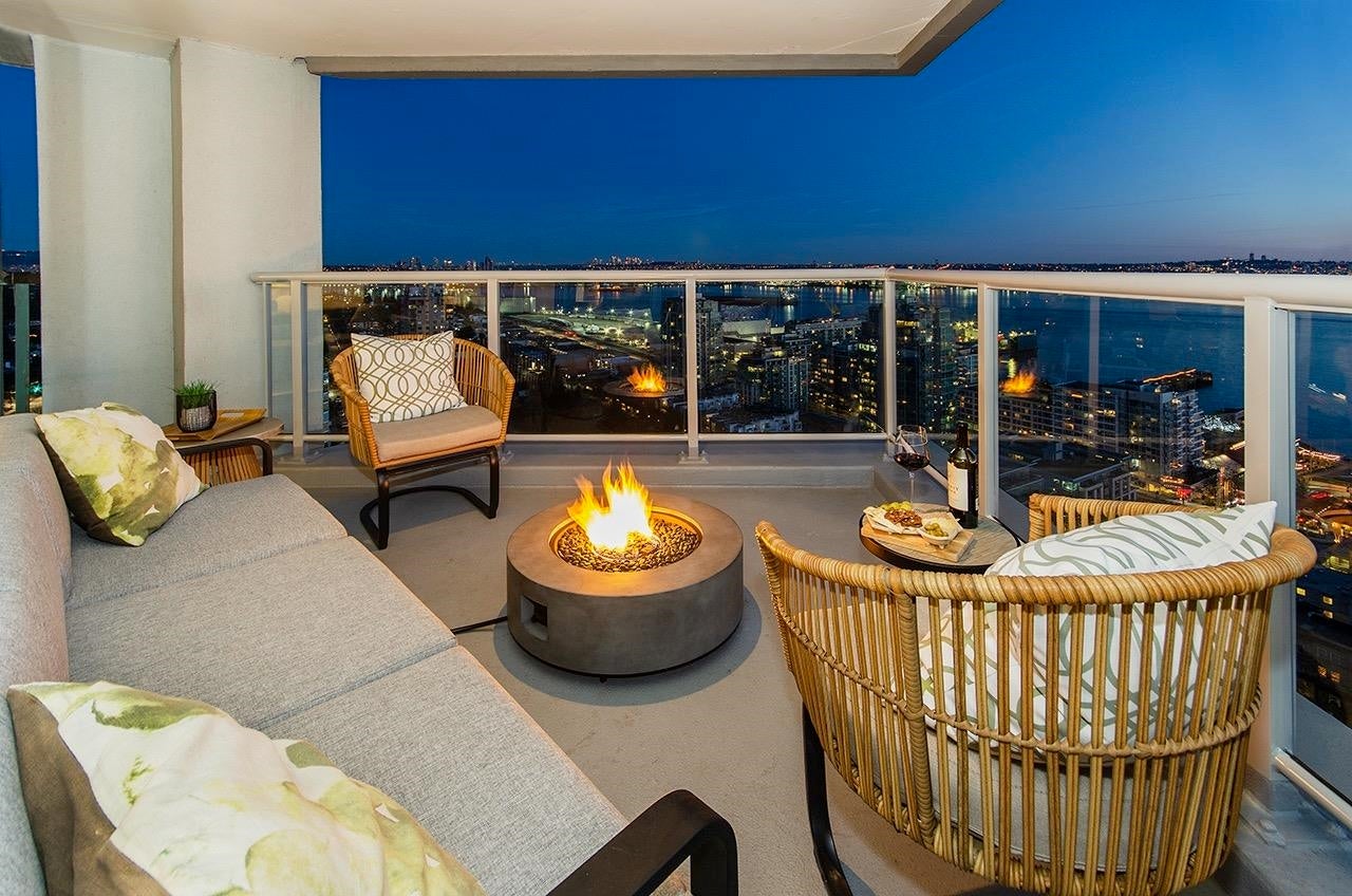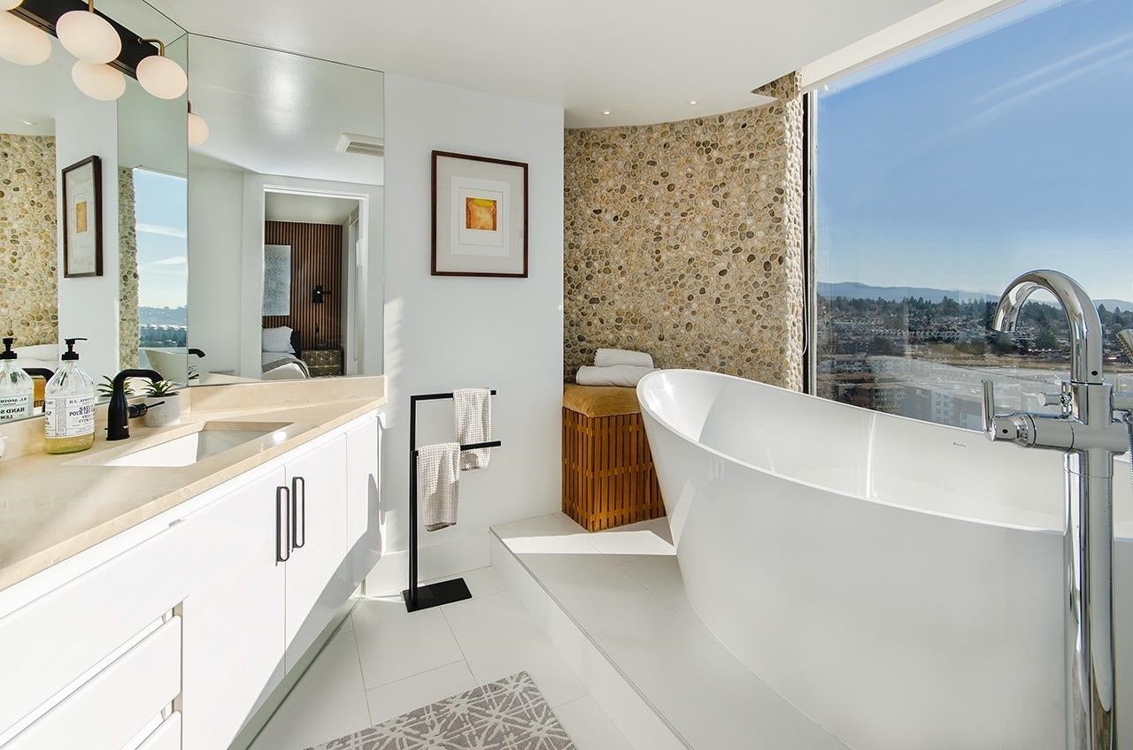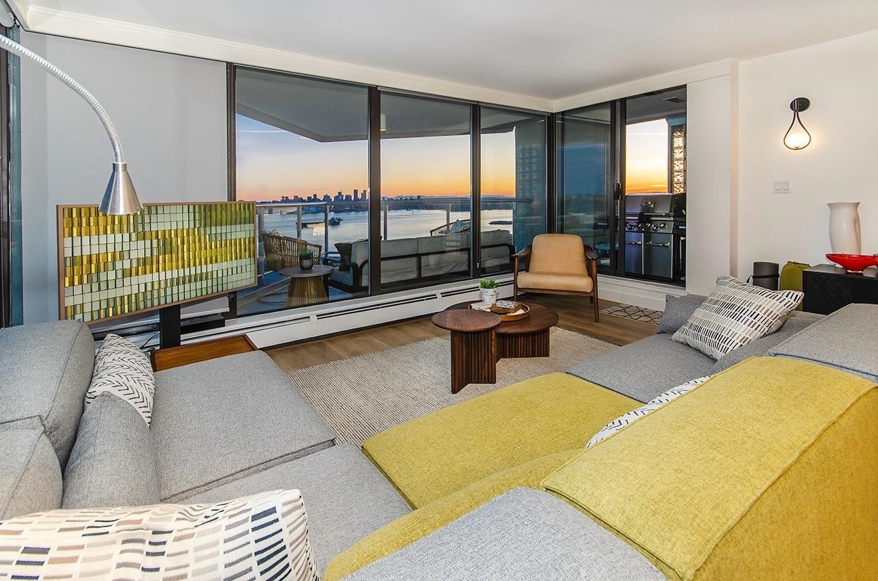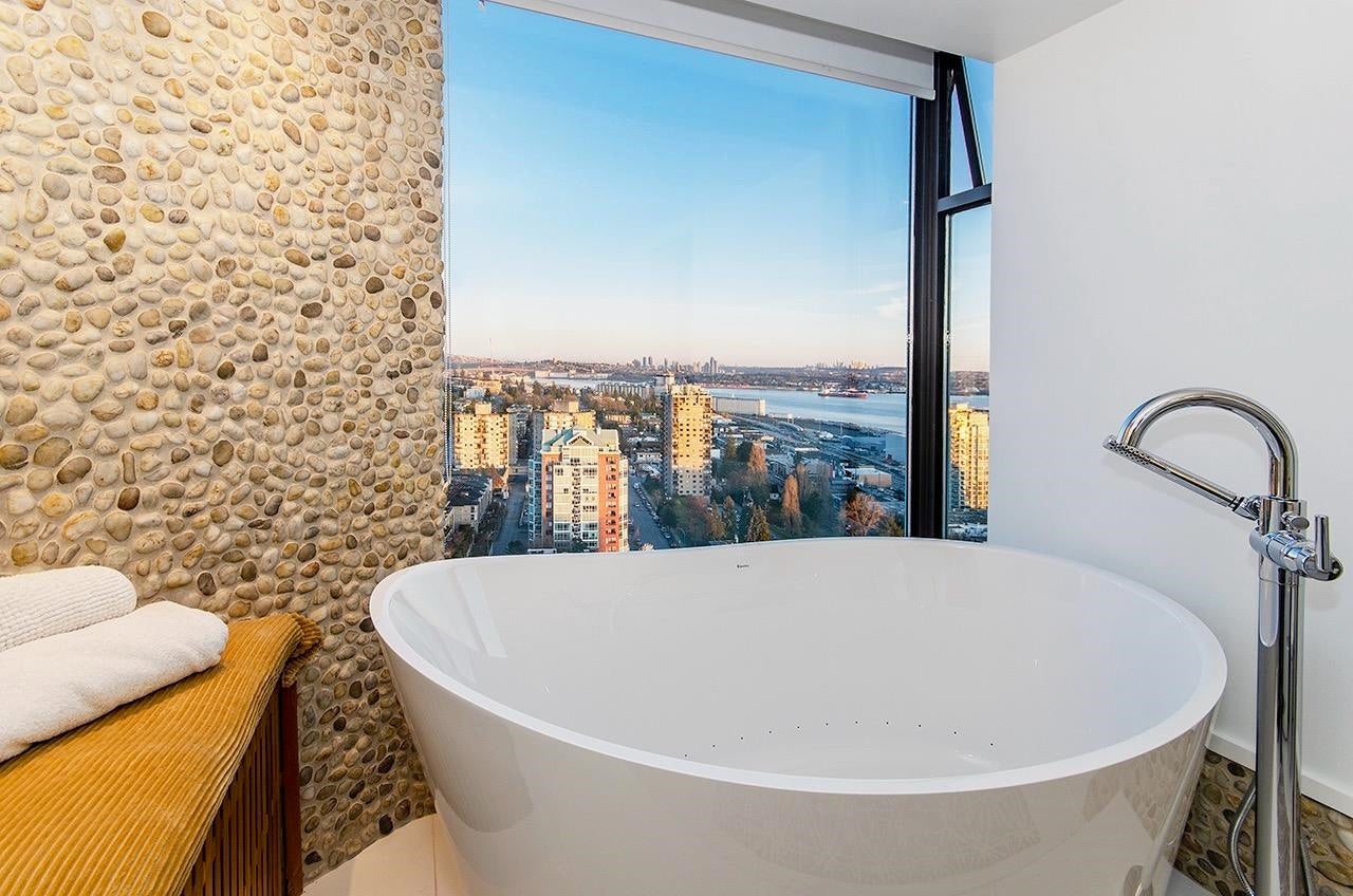 SKY-HIGH LUXURY IN LOWER LONSDALE! Perched on the 26th floor of the area's tallest tower, this nearly 1,100 sq ft masterpiece offers views that simply cannot be topped. Step onto your private patio and get lost in a 270-degree panorama—from Mount Baker and the city skyline to the open waters of the Gulf Islands. This thoughtful renovation features a wide-open kitchen and living area designed specifically to pull those stunning views into every corner of the home, including the spa-like ensuite with therapeutic jetted Bath. You’ve got a proper entry foyer, an actual laundry room, and two side-by-side parking stalls (best location, beside lobby entrance). Outdoor pool, Gym and a refreshed lobby exit to the Shipyards’ best coffee and grocery. It's arguably the best seat in the city.