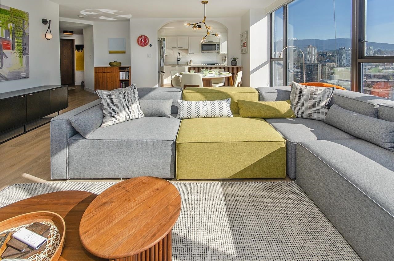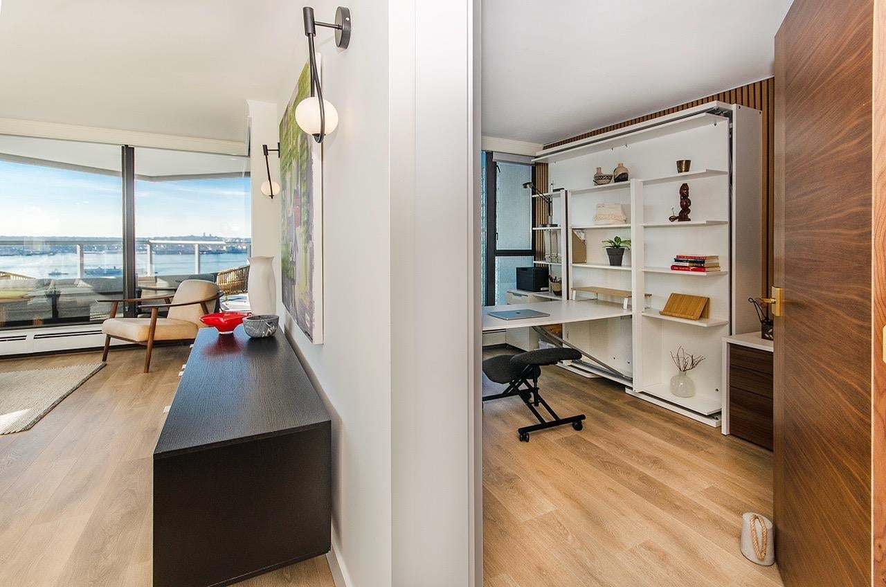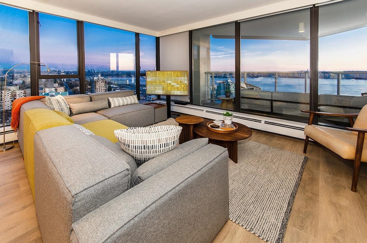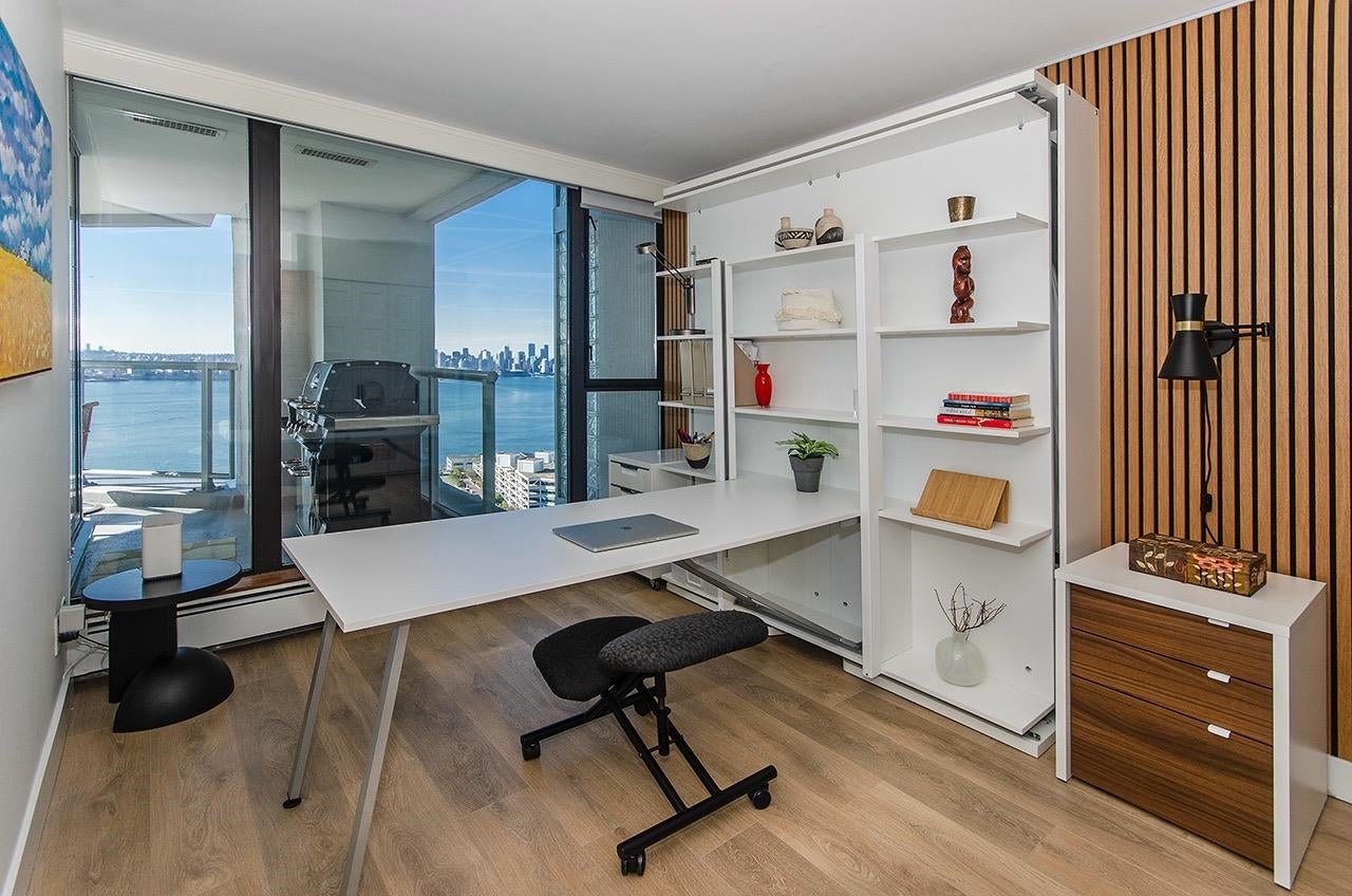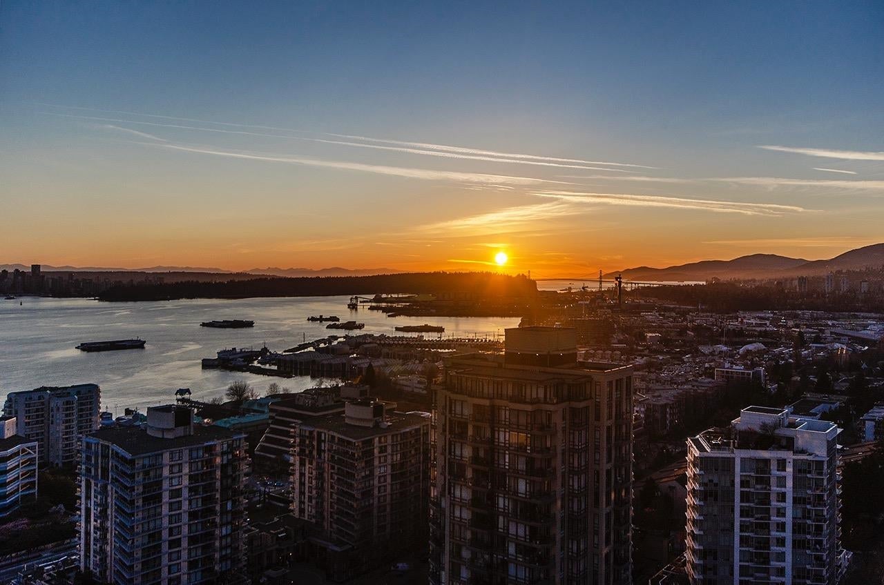 SKY-HIGH LUXURY IN LOWER LONSDALE! Perched on the 26th floor of the area's tallest tower, this nearly 1,100 sq ft masterpiece offers views that simply cannot be topped. Step onto your private patio and get lost in a 270-degree panorama—from Mount Baker and the city skyline to the open waters of the Gulf Islands. This thoughtful renovation features a wide-open kitchen and living area designed specifically to pull those stunning views into every corner of the home, including the spa-like ensuite with therapeutic jetted Bath. You’ve got a proper entry foyer, an actual laundry room, and two side-by-side parking stalls (best location, beside lobby entrance). Outdoor pool, Gym and a refreshed lobby exit to the Shipyards’ best coffee and grocery. It's arguably the best seat in the city.